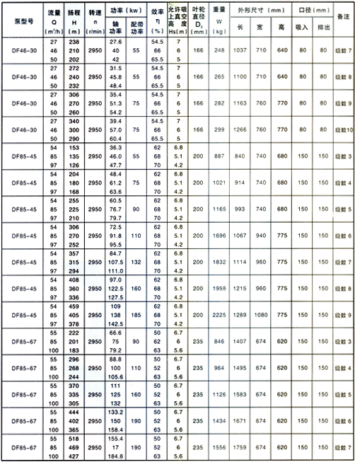 DF型泵供输送温度为-20~105℃,不含固体颗粒、有腐蚀性的液体。泵的进口压力小于0.6MPa。DF型泵是卧式、单吸、多级多段式离心泵,泵的出口入口均垂直向上,用拉紧螺栓将泵的吸入段、中段、吐出段联结成一体,泵转子由装在轴子的叶轮、平衡盘等零件组成。转子两端由滚动轴承或滑动轴承支撑,滚动轴承用油脂润滑,转子轴向力由平衡盘平衡。