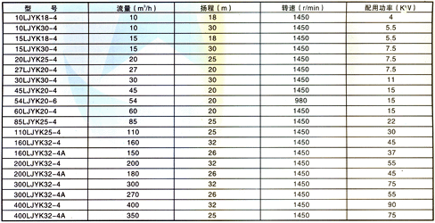 性能范围 流量Q=10~400 m3/h 扬程H=50m。